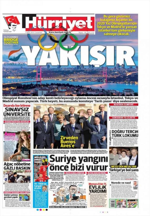 «Ταιριάζει» (σ.σ με την Κων/πολη) είναι ο τίτλος της Hürriyet που υποστηρίζει πως η Κωνσταντινούπολη έχει σοβαρές πιθανότητες για να διοργανώσει τους Ολυμπιακούς αγώνες και τονίζει πως θα είναι η μοναδική Ολυμπιάδα που θα διοργανωθεί σε Ευρώπη και Ασία λόγω του Βοσπόρου.